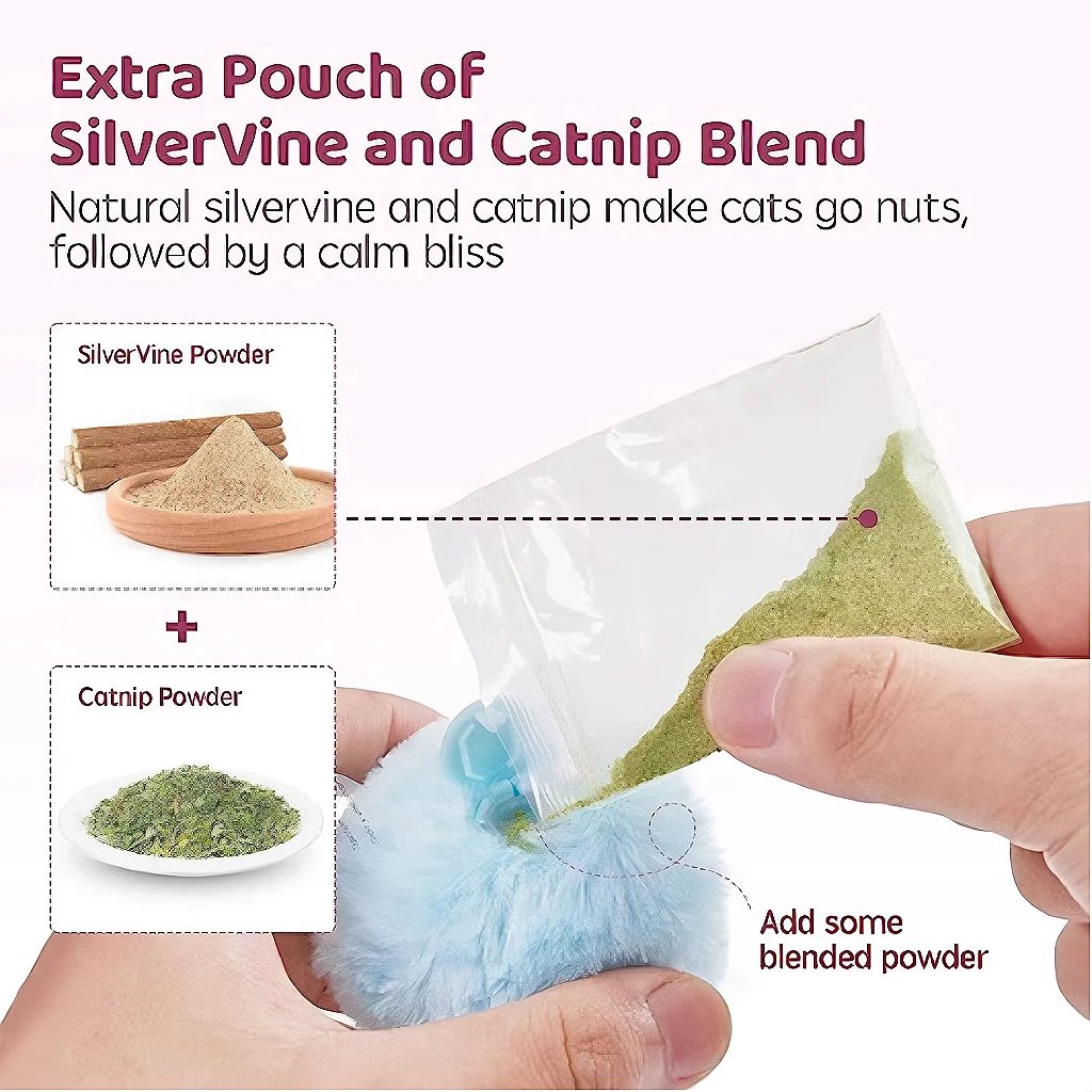 The 3 balls are made from safe and soft fluffy plush materials, comfortable for cats to cuddle and safe to chew. Compared with old version, the upgraded new version is more durable and smarter. They 3 small balls are tougher to be destroyed or damaged by cats.